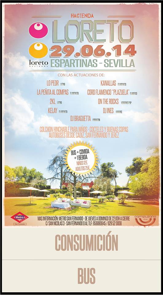 La Hacienda Loreto es un sitio con encanto donde se podrá disfrutar de actuaciones en directo de varios estilos, djs, animadores, karaoke... Finalmente participarán las siguientes formaciones de la Bahía de Cádiz; “Lo Peor”, “Kanallas”, “La Peñita al Compás”, “Coro Flamenco Plazuela”, “2Kl”, “Kelay”, “Dj Inés” y el Dj Braguetta”.
