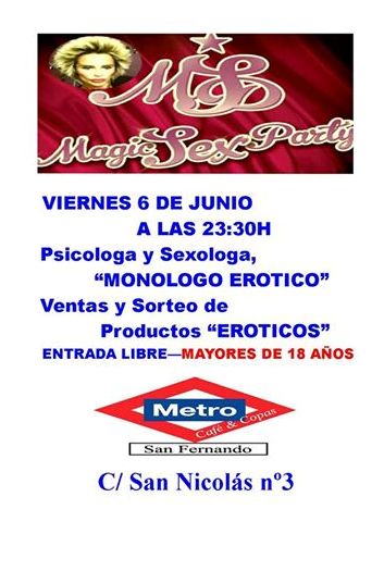 Hoy viernes 6 de junio, a partir de las 23 horas, con entrada libre, tendrá lugar el monologo de “ Yoyo” (Mari Cruz), psicóloga y sexóloga, quien además llevará a cabo su propio tapersex con diversos productos eróticos.