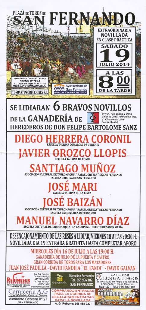El Primer Teniente de Alcalde y Delegado General de Promoción de la Ciudad, el andalucista Fran Romero, ha presentado esta mañana en la Plaza de Toros de San Fernando la novillada en clase práctica que el coso isleño acogerá el próximo sábado 19 a partir de las ocho de la tarde como parte de los festejos de la Feria del Carmen y de la Sal 2014. En esta novillada, explica el Delegado, la Asociación Cultural Taurina 'Escuela de Tauromaquia Rafael Ortega' será la anfitriona y participarán dos jóvenes novilleros de La Isla: Santiago Muñoz y José Baizán, a los que acompañarán en el cartel Diego Herrera Coronil, de la Asociación Escuela Taurina Comarcal de Ubrique; Javier Orozco Llopis, de la Escuela Taurina de Ronda; Jose Mari, de la Escuela Taurina de la Línea: y Manuel Navarro Díaz, de la Escuela Cultural de Tauromaquia 'La Gallosina' del Puerto de Santa María. Los novillos a torear procederán de la Ganadería de los Herederos de Don Felipe Bartolomé Sanz.