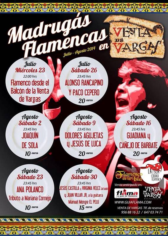 Como cada año se inaugura el ciclo con FLAMENCO DESDE EL BALCON DE LA VENTA DE VARGAS; este año en colaboración con la Peña Camarón de la Isla y la escuela de cantaores de Pedrín García harán los honores Manuel Luca, Pepi Hidalgo y Pacheco, con la guitarra de Didier Macho; las Madrugas Flamencas comienzan el Sábado 26 de Julio con el cante de ALONSO RANCAPINO y la guitarra del mismísimo PACO CEPERO, impresionante dúo, única e histórica noche que nos van a ofrecer.