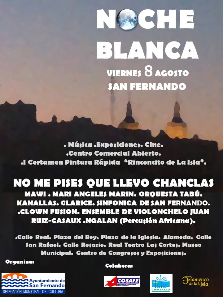 El Delegado subraya la calidad y la variedad de las propuestas elaboradas por la Delegación Municipal de Cultura para la Noche Blanca 2014. El cartel de esta edición estará encabezado por el concierto del mítico grupo andaluz 'No me pises que llevo chanclas', liderado por Pepe Bejines. Además de este concierto, que se celebrará en la Plaza de La Iglesia a partir de la medianoche, actuarán en esta velada en las calles de La Isla la coplista isleña Mari Ángeles Marín, la Banda Sinfónica Municipal, el Ensemble de Violonchelo Juan Ruiz-Casaux, Mawi, la Orquesta Son de Mar, el grupo de música africana Ngalan y las formaciones Clarice y Kanallas.