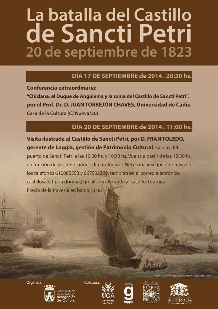 Entre los actos que se prevé celebrar en recuerdo de estos acontecimientos, destaca una conferencia extraordinaria que el doctor Juan Torrejón Chaves impartirá bajo el título "Chiclana, el Duque de Angulema y la toma del Castillo de Sancti Petri". La misma tendrá lugar el 17 de septiembre en la Casa de la Cultura de la localidad vecina, ciudad emocional e históricamente ligada a este bien patrimonial Isleño que, a su vez, remata la desembocadura del caño que marca la línea entre ambos términos municipales.