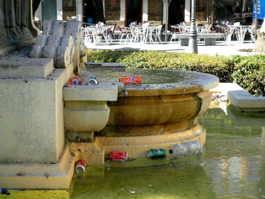 Sólo las dos hileras arboladas que flanquean la plaza por ambos lados, y del pequeño jardín que enmarca la fuente presidida por la estatua ecuestre del General Varela, sobreviven como punto de fuga a una plaza gris que antaño fue considerada como punto verde. Y si bien es cierto que, con independencia del paulatino deterioro del Ayuntamiento, el espacio se mantiene regularmente limpio, no son pocos los días en los que amanece la fuente central repleta de latas, botellas y desperdicios varios, o algunas de las esculturas que decoran la plaza -como el Camaronero de Antonio Mota-, cubierto de pintadas que denotan la poca conciencia ciudadana en torno al espacio público.