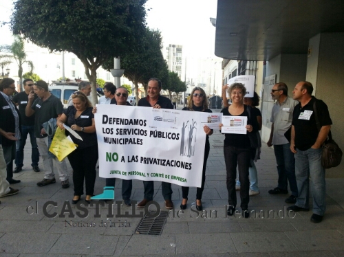 Los empleados públicos municipales han vestido de negro en la jornada de hoy,cumpliendo el acuerdo de la asamblea de trabajadores. A las puertas del Centro de Congresos donde se ha celebrado esta mañana el Pleno ordinario de octubre, se han concentrado los sindicatos del Ayuntamiento, que no descartan la manifestación de los trabajadores del Ayuntamiento. De momento, los viernes seguirán de negro en las oficinas municipales mientras continúen las intenciones de continuar con la privatización de servicios públicos.