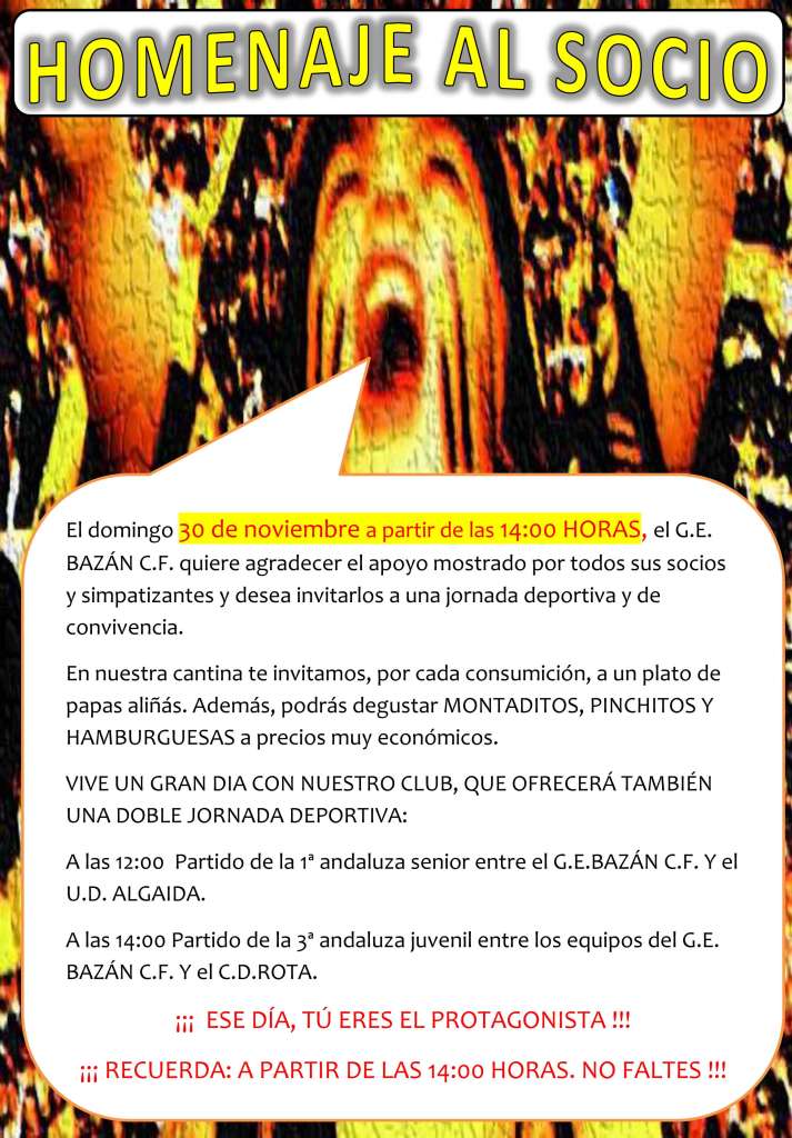 El domingo 30 de noviembre a partir de las 14:00 horas, el G.E. BAZÁN C.F. quiere agradecer el apoyo mostrado por todos sus socios y simpatizantes y desea invitarlos a una jornada deportiva y de convivencia. Montaditos, pinchitos y hamburquesas a precios muy económicos, todo eon el fin de una gran convivencia de socios y aficionados al G.E Bazán C.F. Y todo ello será después del partido que comenzará a las 12:00 horas, de la 1ª andaluza senior entre el G.E.Bazán C.F. y el U.D. Algaida.