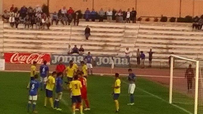 El primero pudo haber llegado en el 16, con el remate a la red de Gabi de un saque de esquina prolongado por Jorge Herrero que, sin embargo, fue anulado. No fue el primer ni el único intento. Carlitos desvió en el primer palo un córner de Ñoño al que seguirían muchos, eso sí, después del primer gol del Cádiz B en el minuto 38. Los azulinos comenzaron a buscar desesperadamente el empate con gritos de ánimo desde las gradas, actitud que continuaría tras el descanso.