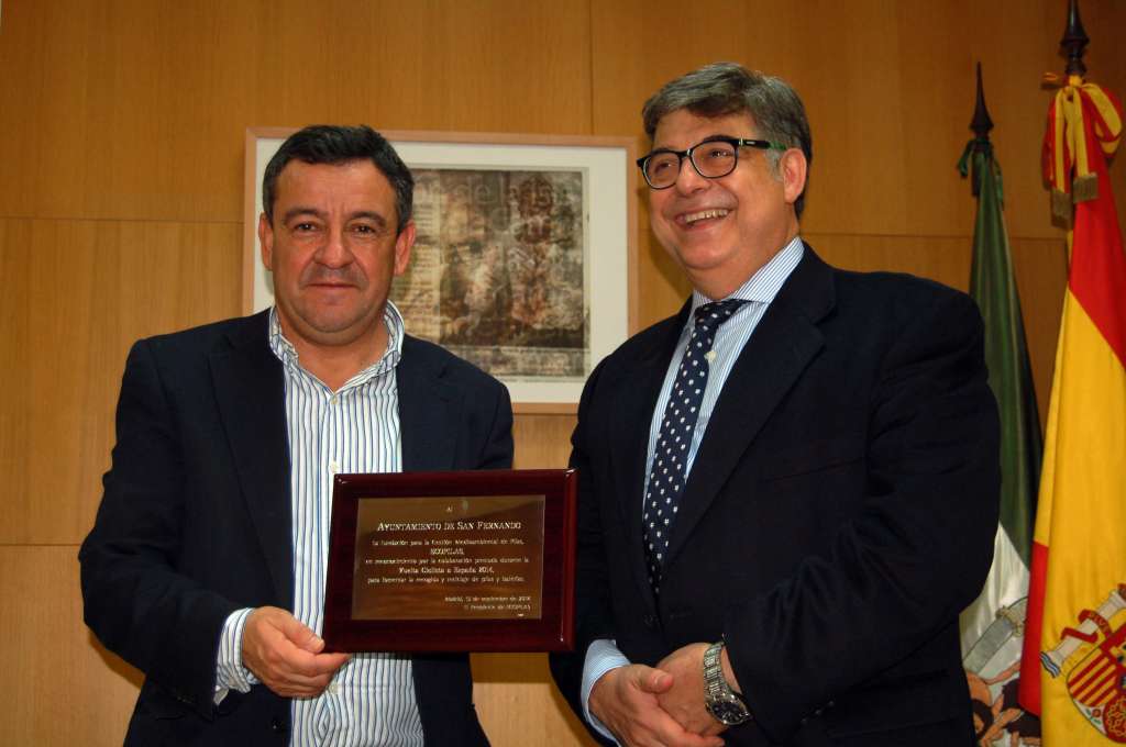 loaiza ecopilasLa Fundación Medioambiental Ecopilas ha reconocido a San Fernando como el municipio más activo en la recogida de pilas usadas, al paso de la última edición de la Vuelta a España. El reconocimiento ha tenido lugar esta mañana con la entrega de una placa a José Loaiza, alcalde de San Fernando, por parte de José Pérez, presidente de Ecopilas.