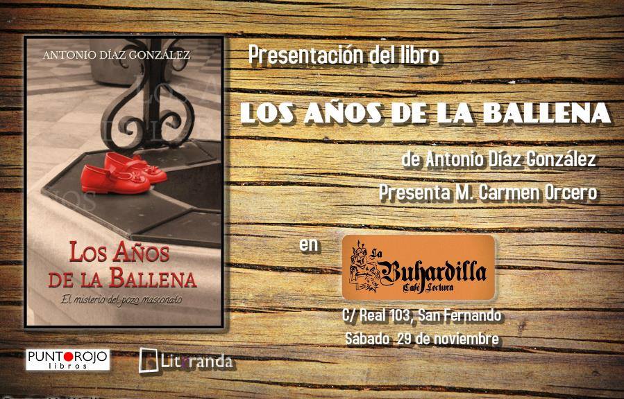 Como ya es habitual ha sido el café La Buhardilla, a partir de las 19:30 horas, el lugar escogido por Antonio Díaz para presentar públicamente la edición impresa de su primera novela, titulada Los años de la ballena en homenaje a una superstición de la época según la cual las ballenas varadas en la orilla simbolizan un mal presagio para aquellas mujeres que se disponían a dar a luz. Algo que el autor aprendió de testimonios reales y de lo cual quiso dejar constancia con un cetáceo ficticio varado en Camposoto días antes del alzamiento nacional.