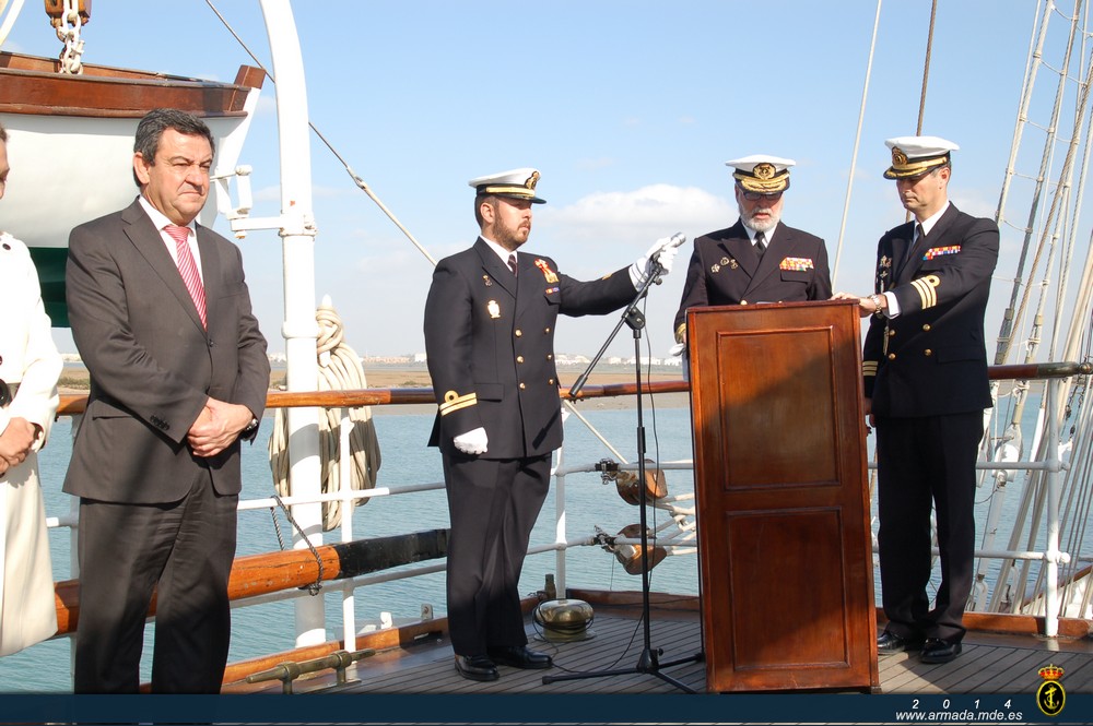El presidente de Correos, Javier Cuesta Nuin, ha entregado hoy un nuevo matasellos dedicado al buque-escuela ‘Juan Sebastián de Elcano’ al Comandante del velero de la Armada, el capitán de navío Enrique Torres. A la ceremonia, celebrada a bordo del buque, que se encuentra atracado en su base del Arsenal Militar de la Carraca, en San Fernando (Cádiz), ha asistido el Almirante de la Flota, Santiago Bolíbar, y una delegación de directivos de la empresa postal.