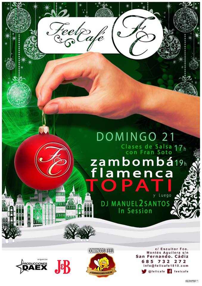 Domingo 21 en Feel Café San Fernando, a partir de las 19 horas, Zambomba, con la actuación de To Pa´ti. Grupo de 5 amigos, que una año más pisarán el escenario de esta sala. Esta formación va recorriendo la geografía andaluza mostrando todo su arte y animando a todos los asistentes dejando siempre un buen sabor de boca. Entrada gratuita.
