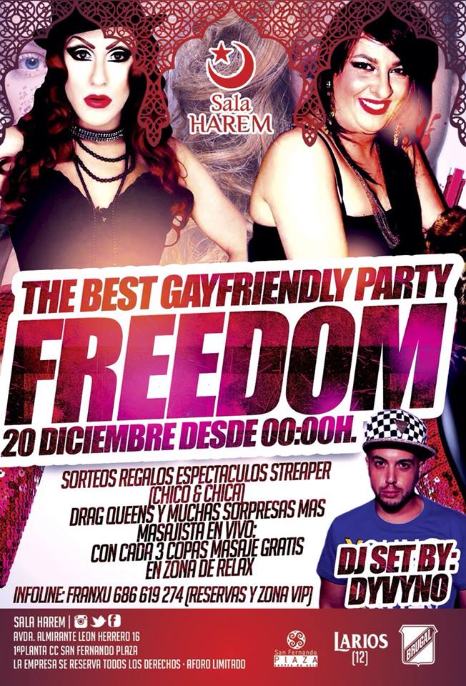 Aunque decirlo así parezca una tontería, dado que no existen públicos heterosexuales, ni homosexuales, estos últimos serán los protagonistas de una noche temática que Sala Harem prepara para este sábado, 20 de diciembre, bajo el título "The Best Gayfriendly Party Feedom".