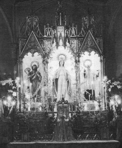 Ya en fotos antiguas de Quijano puede contemplarse a la Milagrosa presidiendo el oratorio que existía en el antiguo hospital de San Carlos, en el camarín central de un retablo neogótico y flanqueada por las efigies de San Carlos Borromeo y San José. Todas ellas salidas, casi con toda probabilidad, de los por entonces populares talleres de Olot, con muy mala prensa hoy en el mundo cofrade debido a su producción de imágenes en serie. Si bien dichas tallas parecen presentar una calidad superior a la media de sus homónimas por datar de un momento en que dichos talleres aún no sufrían de un masivo nivel de industrialización.