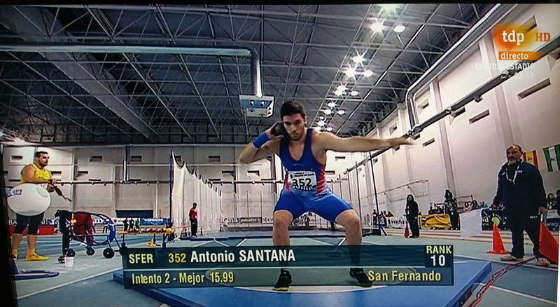 El pasado fin de semana se celebró en la Pista Cubierta del Centro de Tecnificación de Antequera, la 51º Edición del Campeonato de España Absoluto de Atletismo, donde tuvimos el Honor de contar con la participación de nuestro Atleta, Antonio Santana Otero, compitiendo en su especialidad de Lanzamientos de Peso (7,260kg.), donde participan los mejores Atletas de España que hayan conseguido las marcas mÃnimas exigidas por la Real Federación Española de Atletismo.