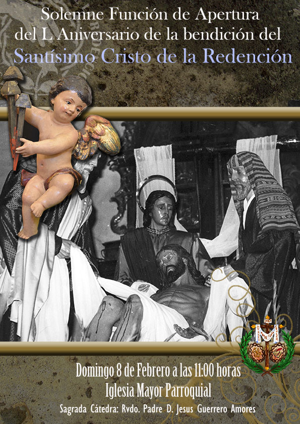 La Hermandad de la Soledad presentará el cartel conmemorativo del L aniversario de la bendición del Santísimo Cristo de la Redención esta tarde, a las 20:00 horas en el Centro de Congresos Cortes de la Real Isla de León. El cartel, pintura del hermano Manuel Sánchez Raposo, será presentado por Alejandro Leiva Rosa, vice-hermano mayor de la Hermandad de San José y delegado de Domingo de Ramos y Hermandades Sacramentales del Consejo Local de Hermandades y Cofradías. Asimismo este domingo 8 de febrero a las 11:00 horas tendrá lugar en la Iglesia Mayor Parroquial la Solemne Función de Apertura del cincuentenario. La Sagrada Cátedra correrá a cargo del Director Espiritual el Rvdo. Padre Jesús Guerrero Amores y la capilla musical estará formada por la soprano Yolanda Tacón acompañada al órgano por José González.