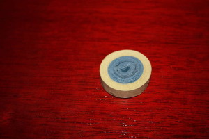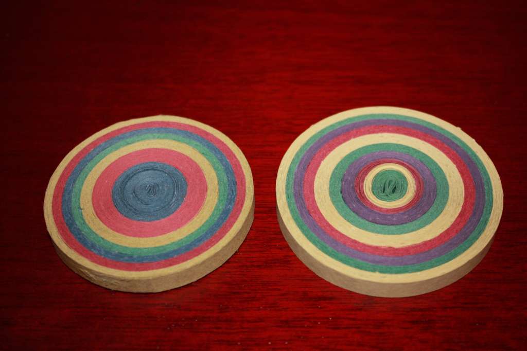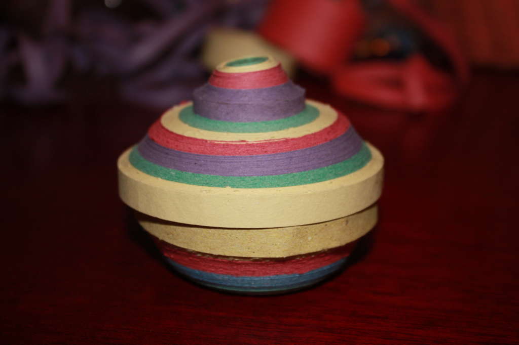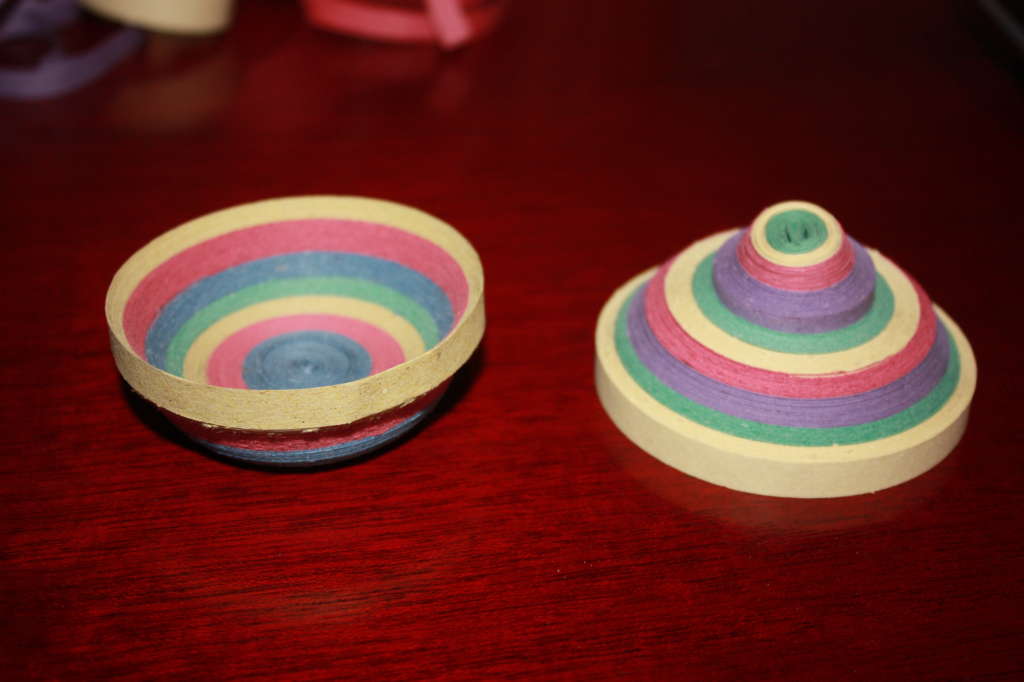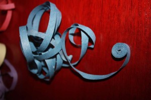Realicemos un sencillo joyerito con serpentín. Cogemos un paquete de serpentina y comenzamos a enrollar una tira formando un círculo (fig. 1). Cuando se acaba la primera le pegamos, con pegamento de barra otra cinta y continuamos enrollando. (fig. 2).