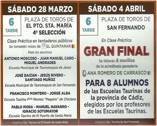 torosEste sábado se celebrará en la plaza de toros de El Puerto de Santa María el último tentadero de clasificación de la competición provincial de escuelas taurinas de Cádiz.  En este último festejo actuarán  los alumnos de la escuela de tauromaquia de San Fernando, Santiago Muñoz,  José Baizán y Jesús Rivero ante reses de la ganadería de “El Quintanar”.