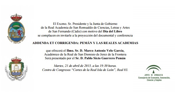 Ya en la semana próxima, el martes día 22, le tocará el turno a la Academia de San Romualdo en uno de sus numerosos encuentros con invitados de prestigio. El motivo, en esta ocasión, es el Día del Libro: jornada señalada en el calendario de cualquier amante de las Letras que en el Centro de Congresos se celebrará con la proyección de un documental y la conferencia ‘Addenda et Corrigenda: Pemán y las Reales Academias’. La misma será impartida por Marco Antonio Velo García, académico de la Real de San Dionisio de Jerez de la Frontera, previa presentación de Pablo Sixto Guerrero Pemán. Dará comienzo a partir de las 19:30 horas.