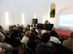 Manzano vino a cubrir la conferencia que en un primer momento estaba previsto que impartiera el arquitecto director de las obras de rehabilitación de la fortaleza, José Carlos Sánchez Romero. Fue presentado por Diego Cano, arquitecto municipal implicado en el proyecto, como paso previo a una breve pero completa introducción histórica sobre los orígenes imprecisos de la fortificación como construcción islámica u obra cristiana, “un edificio único en el mundo”, recordó en relación a las palabras de quien puede considerarse el “descubridor” del Castillo: Leopoldo Torres Balbás, arquitecto restaurador del siglo XX conocido por su estudio sobre las fortificaciones árabes en España. Faltaron, sin embargo, nombres como Fierro Cubiella o Fernando Mósig, éste último autor de la más completa monografía hasta el momento sobre el Castillo del Lugar de la Puente desde el punto de vista documental, así como los estudios arqueológicos previos a la propia obra de rehabilitación. Señaló, como no podía ser de otra manera, la dualidad respecto al puente, “ya que todo puente debe tener su defensa y más en este caso, como única vía de acceso a Cádiz por tierra”. Para ilustrar su discurso hizo uso de cartografía de la época y abundante documentación gráfica, así como planos de alzado y planta de este Castillo, “muy significativo por pertenecer a una época -la tardomedieval-, de la que conservamos contados vestigios”, aseveró durante la ponencia en la antigua Capilla del Rosario, convertida hoy en salón de actos. Los orígenes, también inciertos del Puente, como vía de comunicación con el continente ya desde época clásica, o la primera mención documentada del Castillo, del año 1328, fueron otros de los incisos que el especialista destacó antes de entrar en materia desde el punto estrictamente formal.