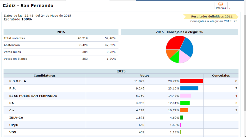 Irrumpe con fuerza Sà Se Puede San Fernando, con 4 concejales; el PA conservarÃa sus 3 concejales y Ciudadanos subirÃa 1, si se tiene en cuenta lo que fue Ciudadanos por San Fernando o posteriormente Ciudadanos por La Isla, alcanzando 3 concejales, desapareciendo de la Corporación Municipal el edil de Izquierda Unida.