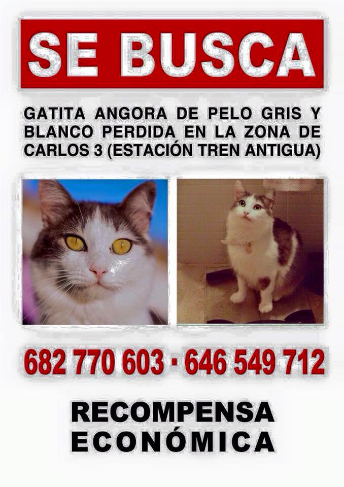 En la manaña de hoy viernes 29, sobre las 09:00 horas, ha desaparecido en la zona de Carlos III y en los alrededores de la Estación de tren 'San Fernando-Centro', un preciosa gatita de angora.