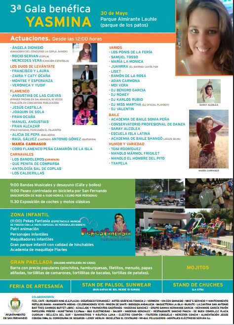 Las actuaciones musicales, por su parte, serán continuadas desde el mediodía con actuaciones para todos los gustos donde predominan el Flamenco, cante y baile, música actual y el carnaval -Los Calderillas, Los Bandoleros…-. Jesús Castilla, Joaquín de Sola, Fran Ocaña, Alicia de Pepa, Samuel Tosso, Juan de Ana o María la Mónica son sólo algunos de los conocidos nombres que a través del arte pondrán su grano de arena para engrandecer una jornada tan interesante como necesaria para que Yasmina continúe su tratamiento.