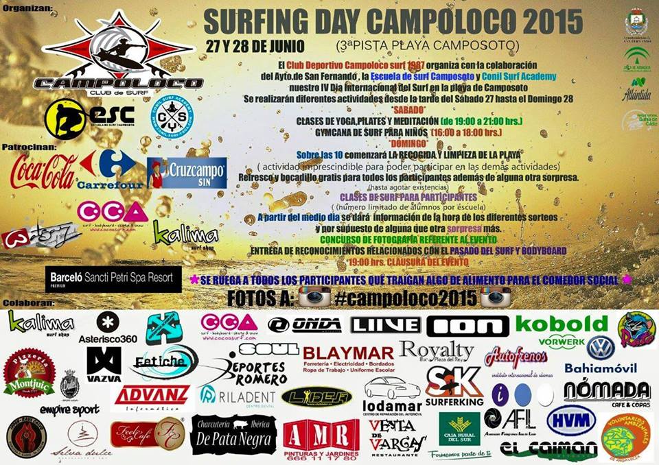 El evento continuará el domingo a las 10.00 horas con una limpieza participativa de la plaza a la que seguirá a las 12.00 un taller de surf para todos a cargo de la Escuela de Surf Campososto y la Conil Surf Academy, que tendrá un número limitado de 80 plazas parta participantes en el evento. En torno a las 13.30 horas aquellos que hayan colaborado en la limpieza participativa de la playa podrán disfrutar de un almuerzo. A las 18.00 horas se dará a conocer el nombre del ganador del concurso de foto en Instagram dedicado al Surfing Day 2015 y a las 18.30 se procederán a dar los habituales sorteos de premios y reconocimientos anuales: a las leyendas y leyendas del surf y del bodyboard en Camposoto y a aquellos que ya no están con nosotros. El Surfing Day 2015 concluirá a las 19.00 horas con la tradicional foto de familia a cargo de los fotógrafos del Club Deportivo Campoloco Surf 1987: Alfonso Vázquez y Lolo Picardo.