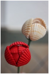 Las flores, simplemente es pintar conchas con pintura al agua y pegar a un palillo de pinchitos con un poco de silicona caliente.