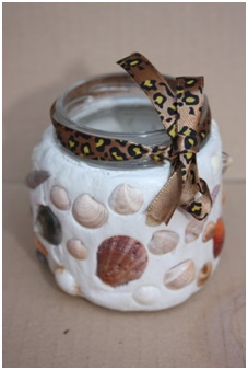 El tarro de cristal, es pegar pasta de modelar y utilizando cola, ir clavando en la pasta caracolas. Dejar secar y luego colocar un lazo arriba y listo.