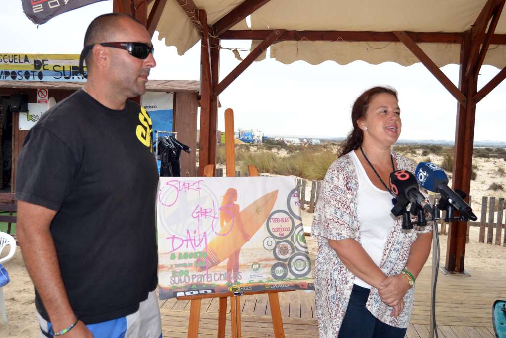 La delegada Municipal de Deporte y Playas, la andalucista Maite Lebrero, ha presentado esta mañana en el módulo de la Escuela de Surf Camposoto el Surf Girls Day, que la Escuela de Surf Camposoto desarrollará en la Playa de Camposoto el próximo sábado 8 de agosto a partir de las 11.00 horas. Durante la presentación Lebrero ha estado acompañada por Antonio Conesa, representante de dicha Escuela. Esta iniciativa está organizada por la Escuela de Surf Camposoto en colaboración con el Área Municipal de Desarrollo Sostenible, Kalima Surf, Ión y la Federación Española de Surf.