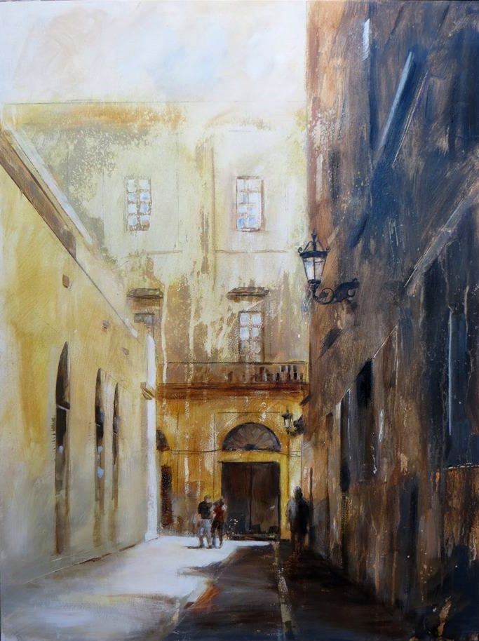Son las palabras de quien en la actualidad se encuentra a la cabeza del colectivo gaditano de acuarelistas, aunque en este caso optó por emplear también el acrílico, ya que "puedes corregir, se seca pronto... iba con la idea en la cabeza tras varios paseos por la ciudad y, además, me apoyé en material gráfico", aclara. Su obra refleja la fachada trasera del Ayuntamiento, desde el Mercado Central de Abastos. Un lugar que pronto se vio obligado a abandonar debido a su concurrencia. "Terminé la obra en la Plaza del Rey".