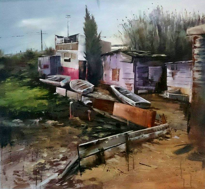 Lucena optó, tras un meditado paseo, por reflejar las casitas de pescadores que existen en la zona de Puente de Hierro. Tras hablar con sus vecinos, hizo varias fotos y estudió minuciosamente el encuadre elegido. "Me gusta pintar elementos de chapa, chabolas, barrios costeros y casas en ruina... porque dan mucho juego", explica. Para ello empleó técnica mixta: "construí el cuadro con acrílico y reforcé con óleo algunos detalles", el color hizo el resto. Aunque el día comenzó gris, la vistosidad del conjunto arquitectónico permitió que el artista diera rienda suelta a su paleta particular.
