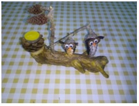 Os presento en esta ocasión, una simpática manualidad para la que utilizaremos: restos de troncos caídos y secos, piñas de pino, silicona caliente, ojitos de plástico, cartulina marrón y negra y vela.
