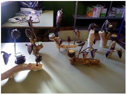 Una vez acabados los búhos, tratamos un trozo de tronco seco, lo podemos lijar, barnizar y dejarlo tal cual esté. Le hacemos unos taladros pequeños al tronco, en los cuales colocaremos los búhos antes realizados. Añadiremos otra piña, esta vez de las abiertas, a la que quitaremos la parte de arriba y en su lugar colocaremos una pequeña vela.