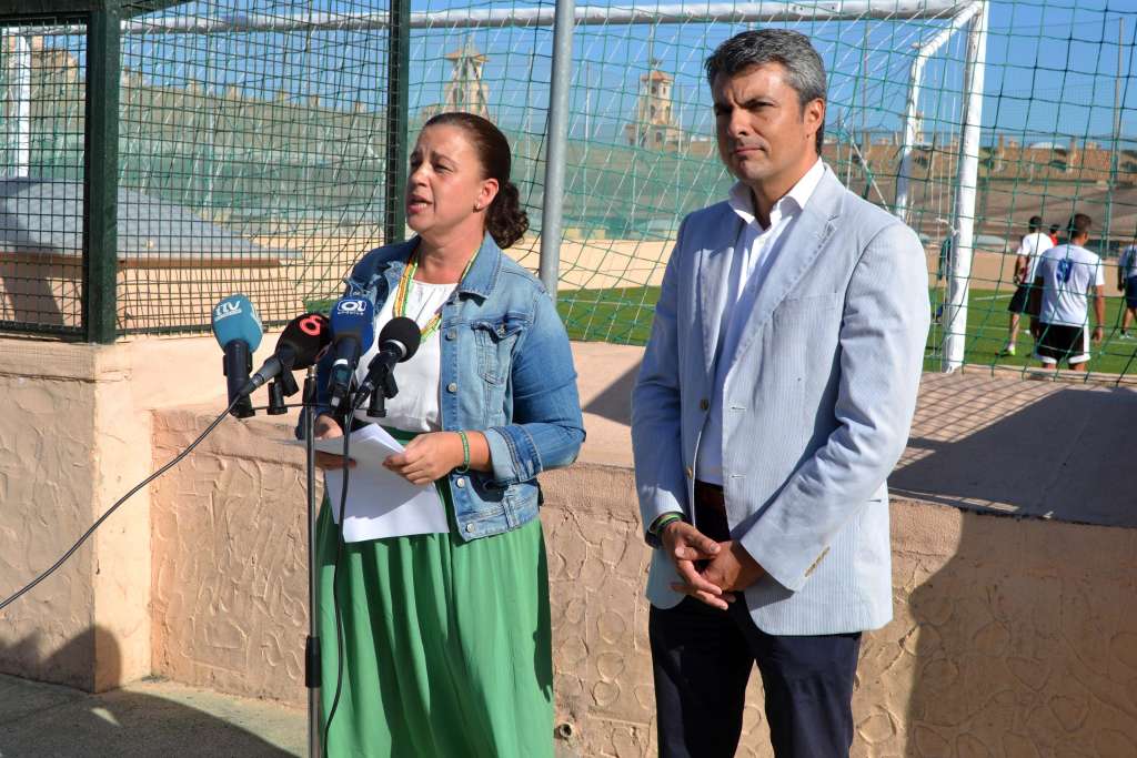 El primer teniente de alcaldesa, Fran Romero, y la delegada Municipal de Deportes, Maite Lebrero, han visitado esta mañana el campo de fútbol indoor de la Ciudad Deportiva de Bahía Sur para realizar balance sobre al gestión realizada por el Patronato Municipal de Deportes durante los cien primeros días de este mandato. Precisamente, una de las mejoras emprendidas durante este periodo es la sustitución del césped del campo de fútbol indoor, que se llevó a cabo durante el presente mes de septiembre por importe de 23.608,96 euros. Lebrero se ha encargado de dar detalle de las principales actuaciones acometidas por el Patronato Municipal de Deportes durante estos cien días: