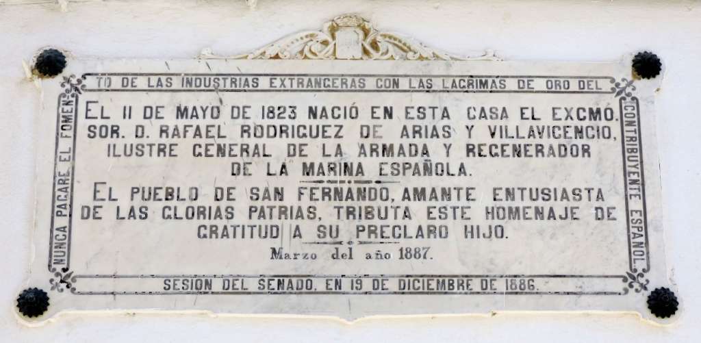 Es la dedicada a éste último, sin duda, una de las más antiguas que decoran los muros del centro, al final de la calle Santístima Trinidad, lindando con la plaza que heredó su nombre y, de paso, el centro de salud que ocupó este espacio, antaño conocido como 'plaza de Viñuelas'. Hijo Preclaro de la ciudad, Rodríguez de Arias fue un ilustre General de La Armada, Ministro de Marina, nacido en dicha casa el 2 de mayo de 1823. El pueblo de San Fernando, amante entusiasta de las glorias patrias, tributa este homenaje de gratutud, según reza el bloque, perfectamente conservado sobre la fachada, e impuesto en su día a iniciativa de la Junta Popular de Defensa en atención a los servicios practicados para los intereses del país, de la marina y de sus arsenales. Entre otros méritos, a Rodríguez de Arias se le reconoce haber cooperado para que la Marina cediera al municipio los terrenos de la actual Glorieta, luchar contra el despido de operarios de La Carraca y evitar el traslado a Cádiz de la Capitanía General:
