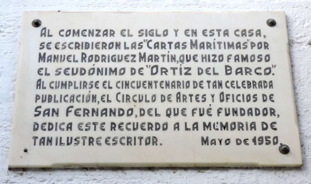Al comenzar el siglo y en esta casa, se escribieron las 'cartas marítimas' por Manuel Rodríguez Martín, que hizo famoso el seudónimo de Ortiz del Barco. Al cumplirse el cincuentenario de tan celebrada publicación, el Círculo de Artes y Oficios de San Fernando, del que fue fundador, dedica este recuerdo a la memoria de tan ilustre escritor.