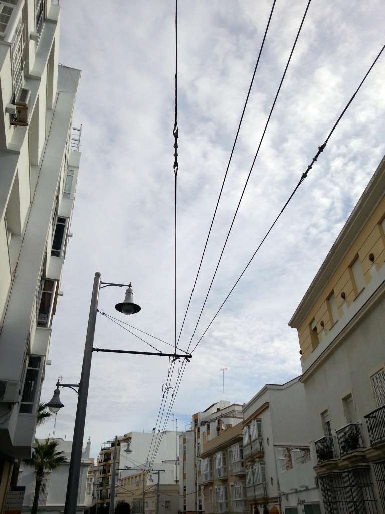 catenariaLo que se ve en la imagen no son telarañas para que la Calle Real tenga más ambiente de Halloween. Es la catenaria del tren tranvía que se une en un punto, después de unir los cables de dos vías. Así está tota la Calle Real. Llena de cables.