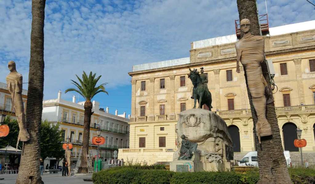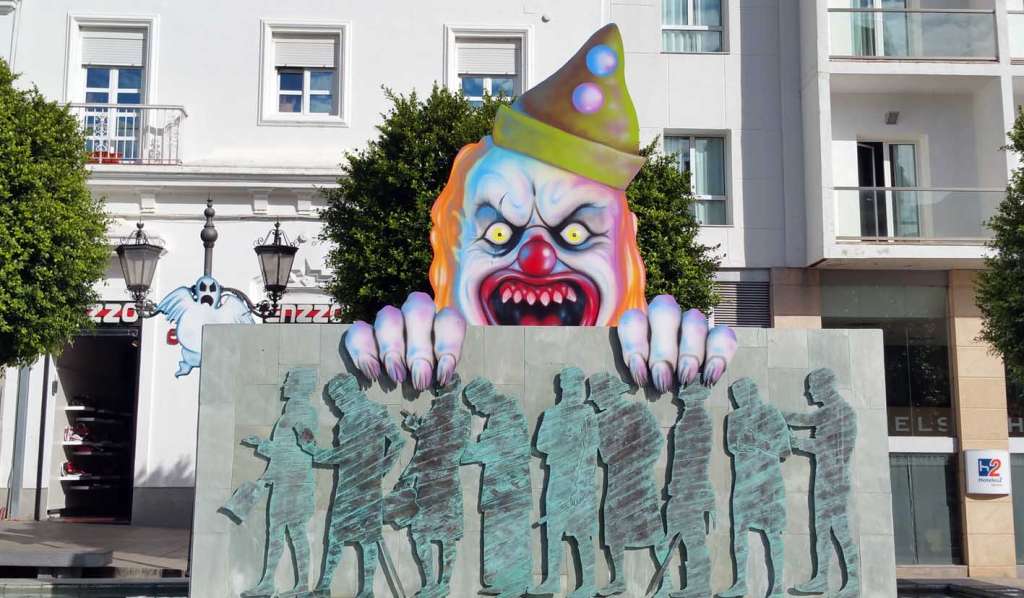 Halloween se vive en las plazas con decoración que se ha incrementado respecto al año pasado. Unas momias aparecen en las palmeras de la Plaza del Rey y en las farolas grandes calabazas. Más criticado ha sido el uso del monumento de Las Cortes, sobre el que se ha colocado un siniestro payaso, y fantasmas en las farolas.