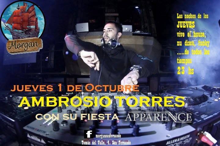 por los mejores deejays. Esta semana será Ambrosio Torres quien amenice la noche, a partir de las 23:00 horas, con su fiesta 'Apparence'. Ambrosio reconocido Dj en las mejores salas gaditanas, trae al Morgan por primera vez esta gran fiesta, donde sonará temas 'Nu disco, house y funcky' de todos los tiempos.