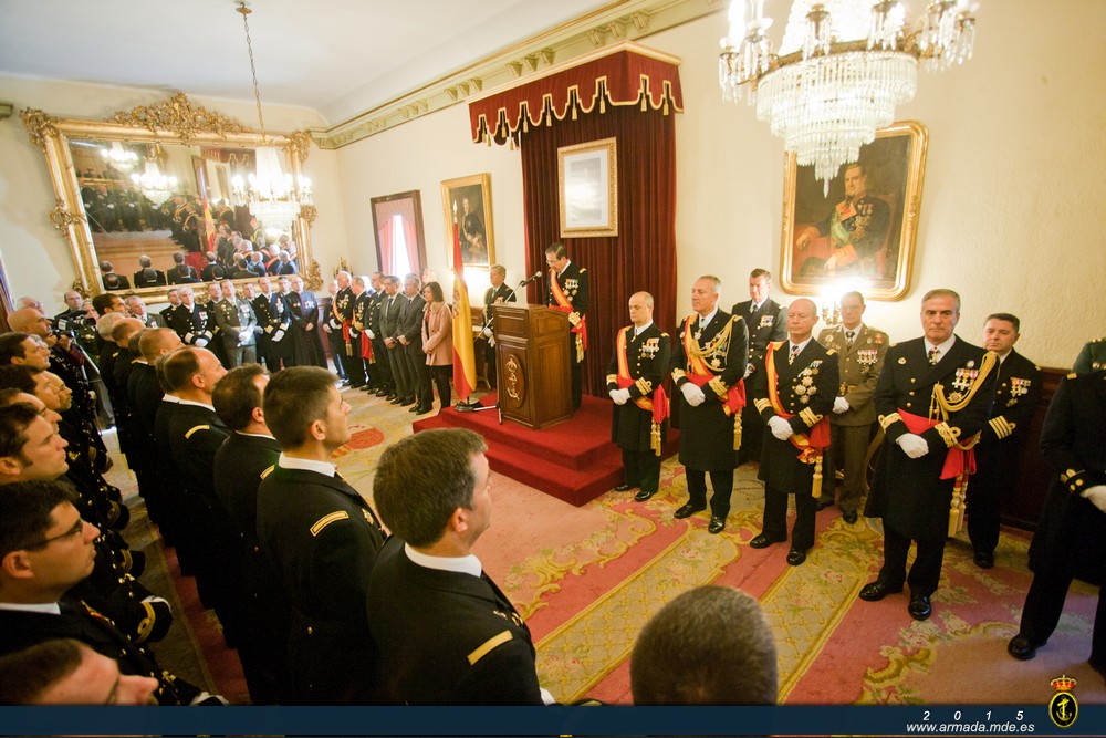 No quisiera terminar sin hacer un doble recordatorio: primero hacia nuestros compañeros que en la mar o en tierra se encuentran lejos de sus hogares cumpliendo con su deber de servicio a la Patria y en segundo lugar, el emocionado recuerdo a todos los miembros de las Fuerzas Armadas y de la Guardia Civil que nos han dejado a lo largo del 2015 y en particular a aquellos que entregaron su vida por España en acto de servicio, ya sea en territorio nacional o en misiones en el exterior.
