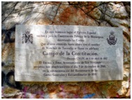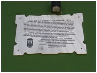 placa_4"Jura de la Constitución de 1812. En este lugar el Ejército Nacional acantonado en la Isla de León recibió y juró la Constitución política de la monarquía española el día 29 de marzo de 1812, celebrando con asistencia de tropas inglesas y portuguesas del propio cantón, y a la vista de los enemigos, una fiesta marcial, en que estrechando íntimamente las relaciones de la más cordial fraternidad entre sí los valientes de tres naciones libres, juraron y pronosticaron la ruina del tirano, y de los viles esclavos que le obedecieron.