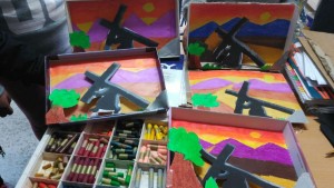 La primera manualidad es un sencillo paisaje, con puesta de sol, que trabajaremos con ceras “manley”. Las difuminaremos con un poco de algodón, obteniendo un efecto fantástico, incluso mezclando colores. Sobre este paisaje (que es el camino de Jesús hasta el monte del calvario, donde es crucificado), pasamos a colocar una silueta de Jesús con su cruz en cartulina negra. Os quedará un cuadro muy original, para enmarcar.borri