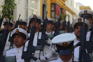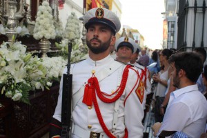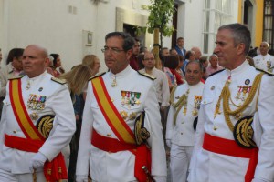 Fue una procesión de silencio, tan sólo roto por el sonido que aportaba la banda de Infantería de Marina y la Compañía de Honores que acompañaban a las autoridades. No hubo música ni tras el paso de la Patrona, ni del Patrón.