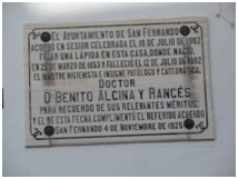 "El Ayuntamiento de San Fernando acordó en sesión celebrada el 18 de julio de 1902 fijar una lápida el esta casa, donde nació, en 25 de marzo de 1853 y falleció el 12 de julio de 1902, el ilustre higienista e insigne patólogo y catedrático, Doctor D. Benito Alcina y Rancés.