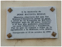 "A la memoria de JOSE BATISTA ROJAS Maestro churrero del que fue Kiosko-ChurrerÃa junto al paso a nivel de la Estación de RENFE, durante más de 40 años. Gracias a él hoy dÃa podemos continuar en esta ChurrerÃa y FreidurÃa. Por lo que su esposa e hijos se lo agradecen y le dedican esta placa. Inaugurada el 15 de octubre de 1995".
