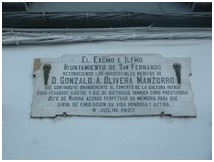 "El Excmo. e Iltmo. Ayuntamiento de San Fernando reconociendo los indiscutibles méritos de D. Gonzalo A. Olivera Manzorro que contribuyó grandemente al fomento de la cultura patria como pedagogo ilustre y que se distinguió también como prestigioso jefe de Marina acordó perpetuar su memoria para que sirva de emulación su vida honrosa y activa.