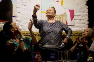 Matilde Coral bailándole a M. José Coca y Cristina Hoyos de palmera. Foto: La Gafa