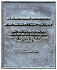 "Al célebre autor carnavalesco José Ramos Borrero "Requeté", San Fernando le dedica este busto en su memoria siendo alcalde la ciudad, José Loaiza García.”