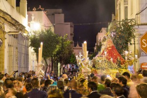 La banda del Maestro Enrique Montero, de Chiclana, acompañó el paso de la Pastora, que lució manto rojo bordado y fue portada por la cuadrilla de costaleros.