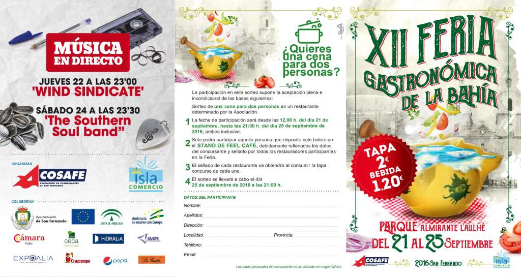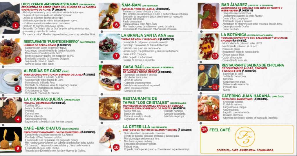En esta edición de la XII Feria Gastronómica de la Bahía de Cádiz, participan 15 restaurantes. Contarán con nuevas carpas. En este caso, similiares a pequeños módulos de feria, en vez de Jaimas. En el mismo estarán Lito's Corner, Restaurante Puente Hierro, Las Alegrías, La Churrasquería, Café Bar Chatus, Ñam Ñam, La Granja Santa Ana, Casa Raúl, Restaurante Los Cristales, La Ceterilla, Bar Álvarez, La Botánica, Restaurante Las Salinas de Chiclana, Feel Café y Catering Juan Harana. En total, restaurantes de San Fernando, Cádiz, Chiclana, Jerez y El Puerto de Santa María.